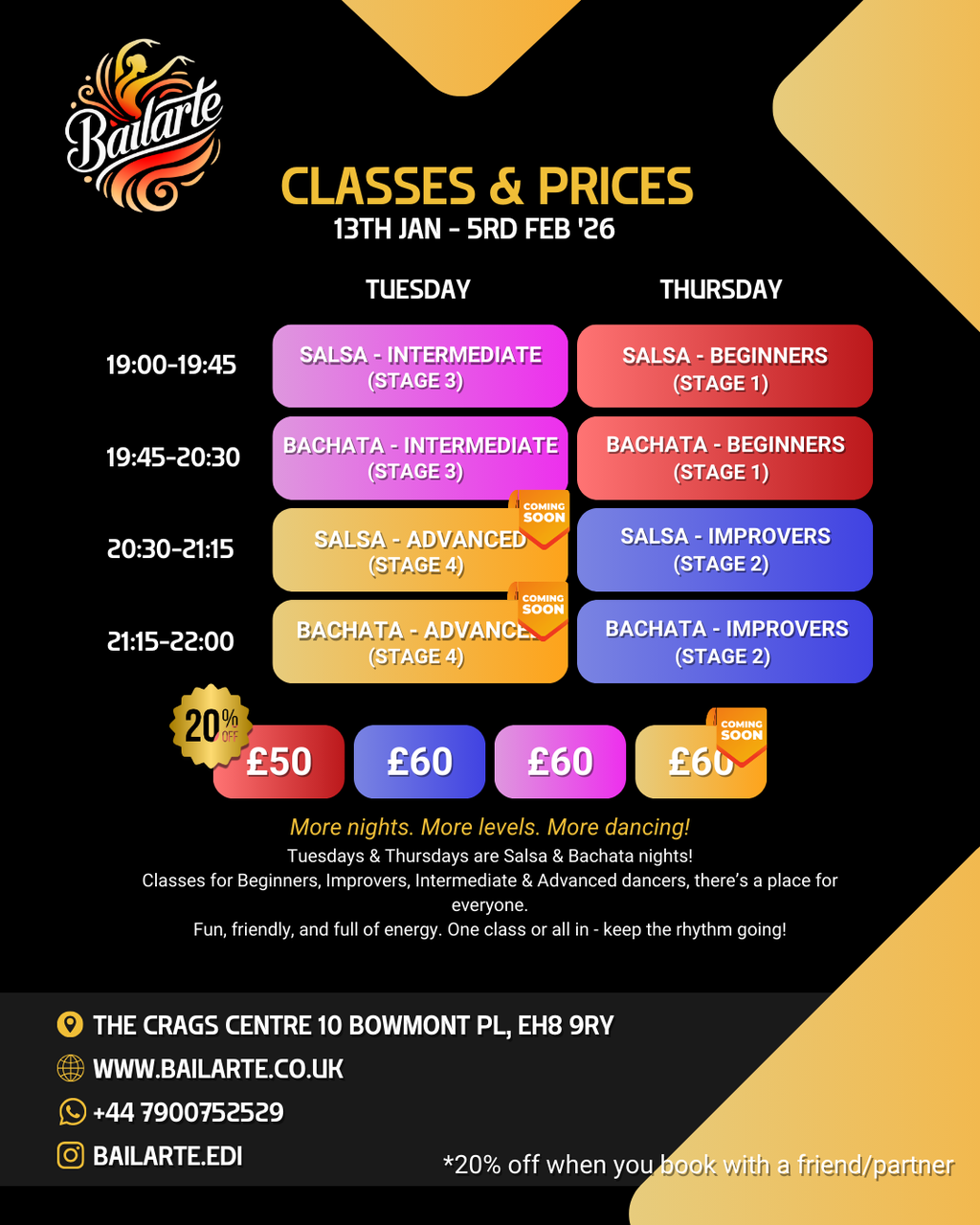Discover our salsa and bachata classes in Edinburgh! We offer weekly Latin dance lessons for beginners, improvers & intermediate - a great way to learn, meet new people and enjoy the rhythm of Latin dance. Classes take place at The Crags Centre, 10 Bowmont Pl, EH8 9RY.